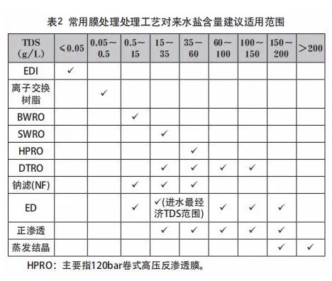 零排放常用膜處理工藝對來水鹽含量建議適用范圍見表2。