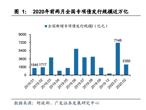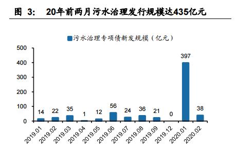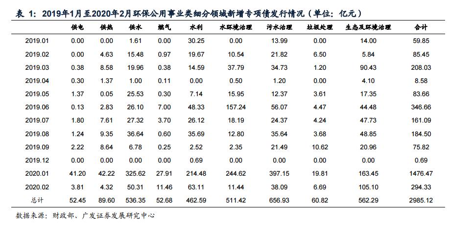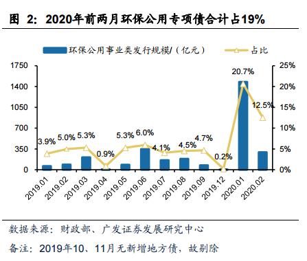 環(huán)保專項債開年以來發(fā)行超預(yù)期,占比同比提高 14 個百分點。根據(jù)財政部披露的專項債數(shù)據(jù)顯示:2020 年前兩月專項債合計發(fā)行規(guī)模 9498 億元,同比增長近 2 倍。專項債投資于基建領(lǐng)域占比同比大幅提升(引用自廣發(fā)宏觀 2020 年 2 月 24 日報告《已發(fā)行專項債投向了哪些領(lǐng)域?》),環(huán)保公用事業(yè)作為基建組成部分,1-2 月新增專項債規(guī)模達 1771 億元,占總發(fā)行規(guī)模的 19%,較 2019 年 3.9%-5%的占比大幅提升。
